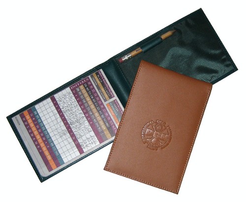 Keeping score has never been easier - round out your tournament or gift presentation with our top grain leather scorecard holder featuring your logo permanently debossed into the leather. Our spacious two pocket holder with separate clear sleeves and pencil loop accommodates most scorecards.