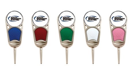 Solid metal repair divot tool with magnetic ball marker. Single prong design helps minimize turf damage when repairing the green. Matte nickel finish. 3.25" x 1.0". Coordinate your logo with six colored shield insert options: red, black, white, green, blue and pink.
